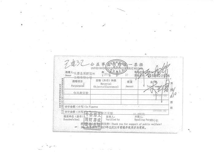 2016年10月10日,我司向文成縣慈善總會(huì)捐款10萬元用于臺風(fēng)救災(zāi)。