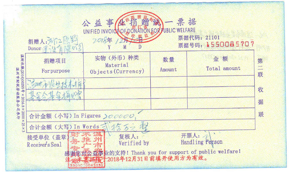 2018年向溫州市農(nóng)業(yè)技術(shù)推廣基金會捐款二十萬元