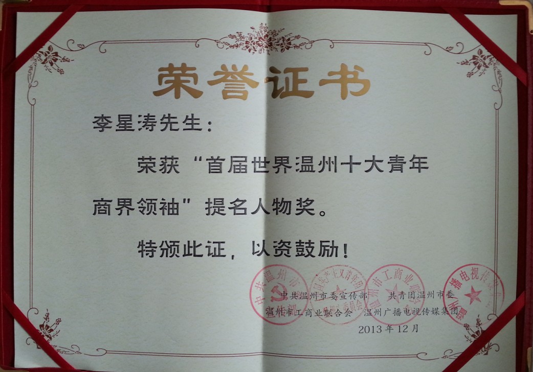 2013-12-2112月18日,首屆世界溫州十大青年商界領袖頒獎典禮在溫州大劇院舉行,李星濤榮獲首屆世界溫州十大青年商界領袖提名人物獎。本次評選活動由中共溫州市委宣傳部、共青團溫州市委、溫州市工商業(yè)聯(lián)合會、溫州廣播電視傳媒集團聯(lián)合舉辦。