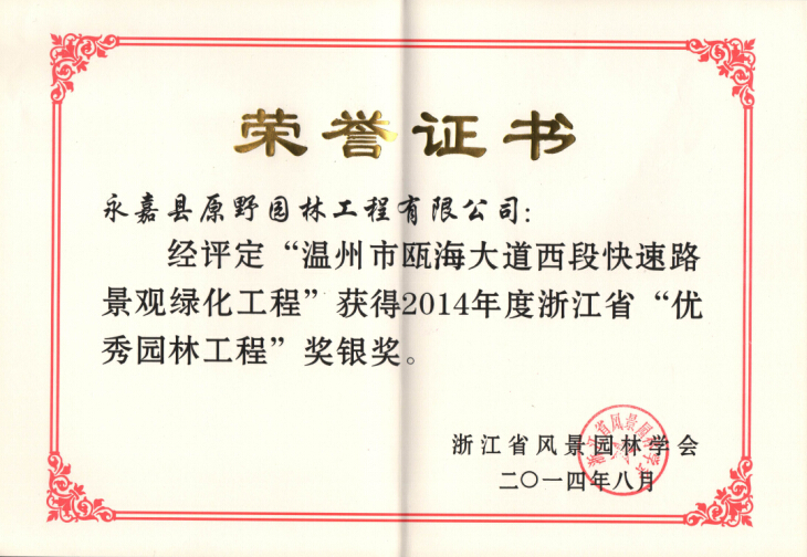 2014-12-2912月25日,2014年度“浙江風景園林學會優(yōu)秀園林工程獎”頒獎大會暨年會在杭州召開,我司溫州市甌海大道西段快速路景觀綠化工程項目獲得銀獎。再次為我司爭得了榮譽,其實,這個項目只是無數(shù)原野獎項的一個縮影,綜觀原野項目獎項之路,凝聚的是原野人專業(yè)的態(tài)度,沉淀的是原野人用心呵護作品的敬業(yè)精神。