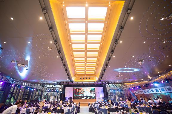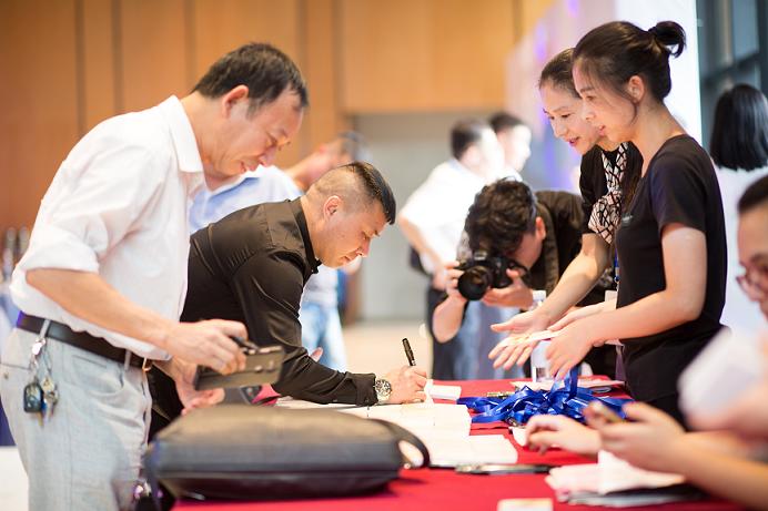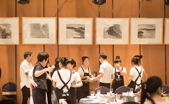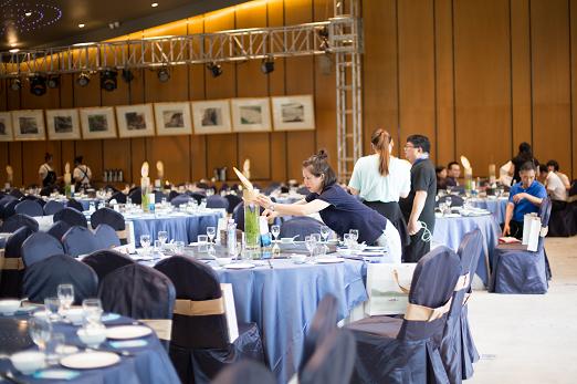 從農(nóng)業(yè)園門口進(jìn)入,就看到2名原野職工身著工作服等候在分叉口,接引各方來賓。12個(gè)項(xiàng)目展示牌分立在道路兩側(cè),一進(jìn)門就能感受到濃濃的招商氛圍。會議館由原木與玻璃為主材料搭建,一泉活水圍繞著會館潺潺流動,它就這樣聳立于鮮花與植物的海洋中,與其融為一體,宛若天成。步入會館,入目可見的是原野工作人員忙碌卻有序的身影,主管、策劃人和服務(wù)員分工明確,各司其職,會場井然有序。百名會長緩緩步入會場,首先到簽到處簽名拍照留念,隨后安排入座。會場墻上的永嘉山水畫,配上屋頂暖暖的燈光,營造了“家”的溫馨,隨著商會會長用金粉在百名會長簽名的“圓月”上繪出一個(gè)“家”,把會場氣氛推向了高潮。