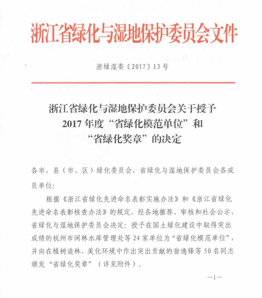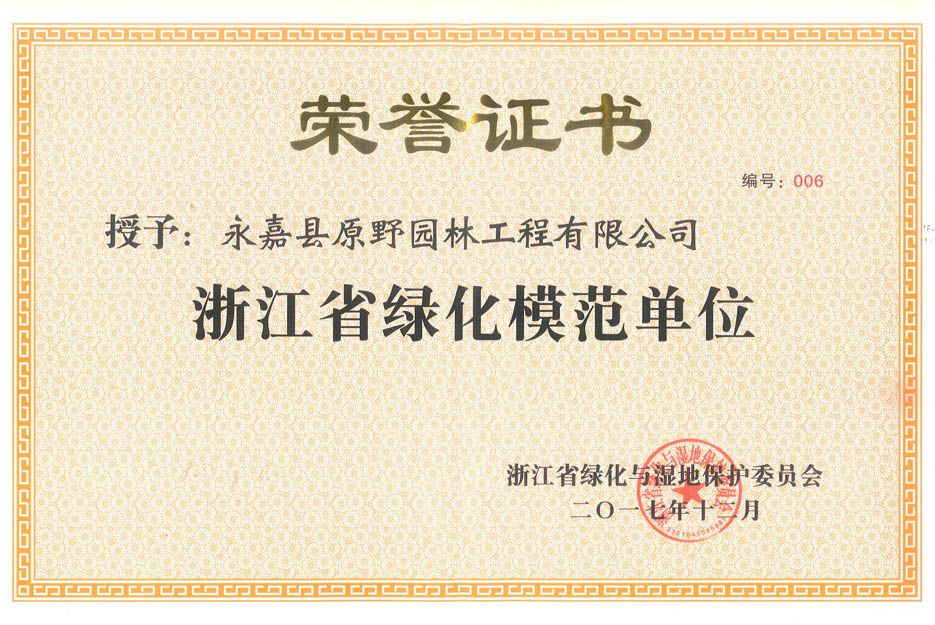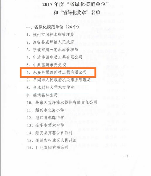 2018-03-03日前,浙江省綠化與濕地保護(hù)委員會(huì)正式公布了2017年度“省綠化模范單位”名單,永嘉縣原野園林工程有限公司名列其中,這是原野在綠化工作方面創(chuàng)建的又一個(gè)省級(jí)榮譽(yù)。