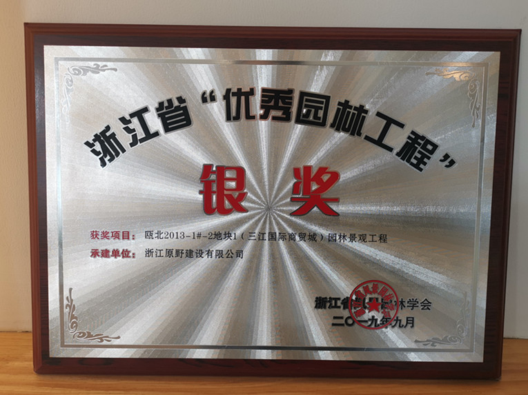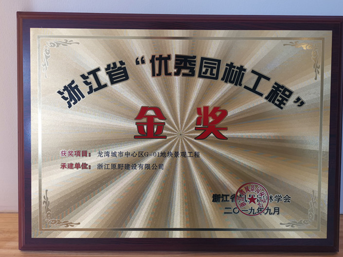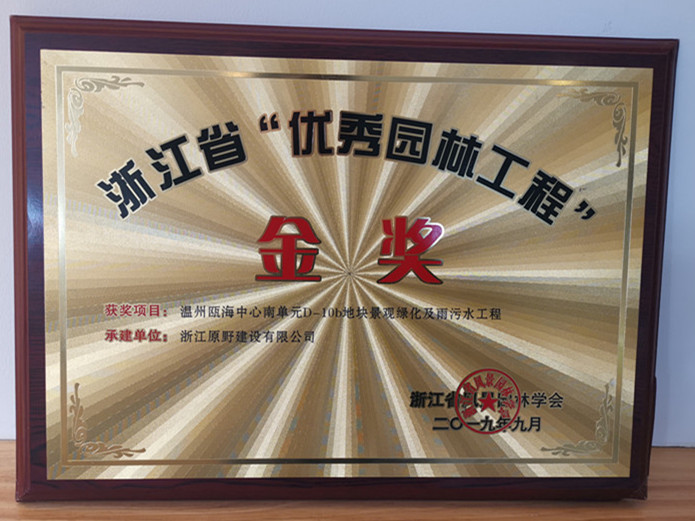 2019年9月,原野集團承建的“龍灣城市中心區(qū)G-01地塊景觀工程”、“溫州甌海中心南單元D-10b地塊綠化及雨污水工程”、“甌北2013-1#地塊(三江國際商貿(mào)城)園林景觀工程”三個項目分別獲得2019年度浙江省“優(yōu)秀園林工程獎”金獎、銀獎。