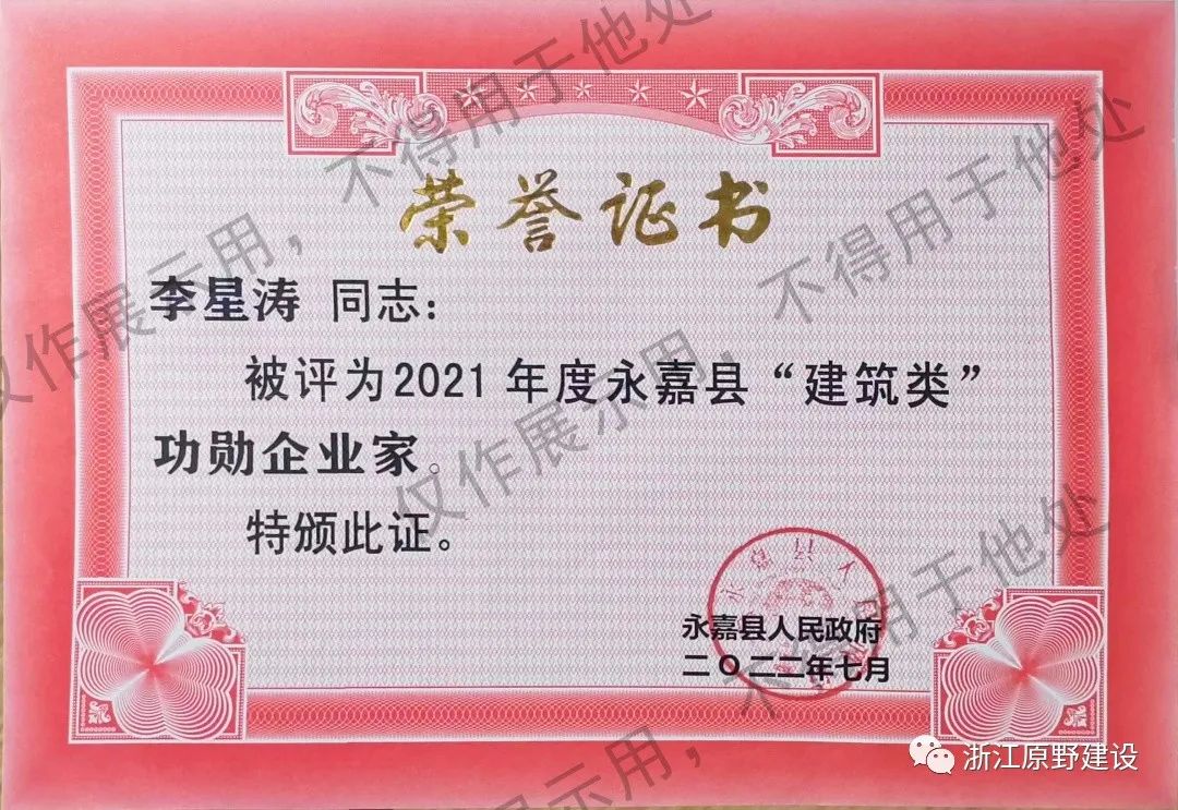 近日,收到永嘉縣人民政府頒發(fā)的榮譽牌匾。浙江原野建設(shè)有限公司獲評永嘉縣功勛企業(yè),此前,已連續(xù)兩次獲評功勛企業(yè)。浙江原野建設(shè)有限公司董事長李星濤獲評功勛企業(yè)家。