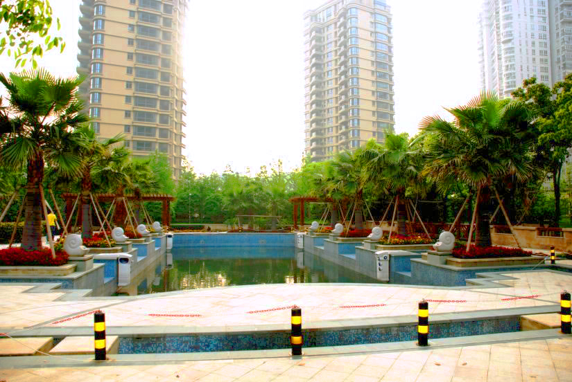 該工程包括游泳池、亭子、景墻、園路、鋪裝、綠化等。